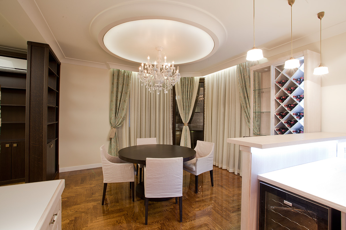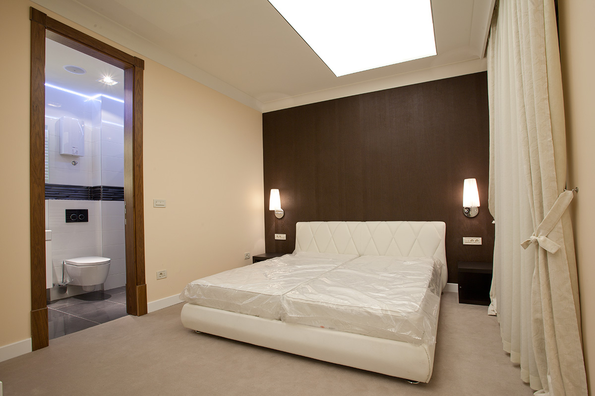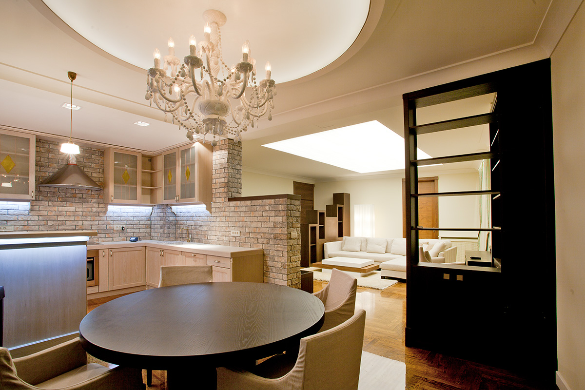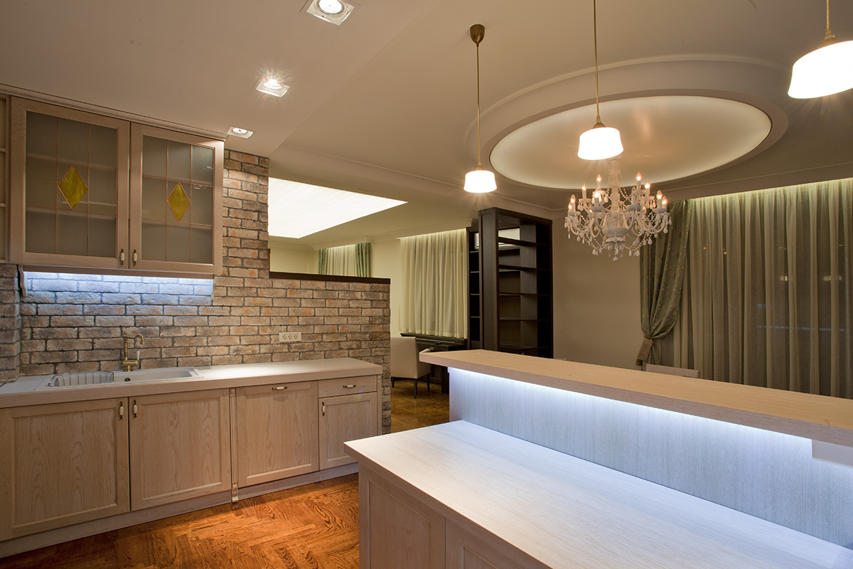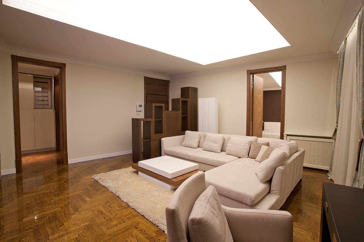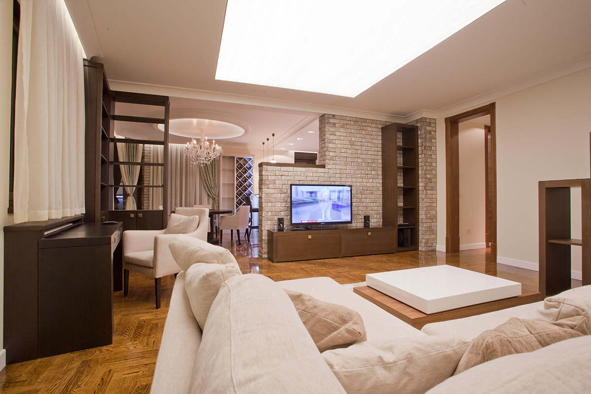 Ekskluzivni penthaus sa kružnom terasom. Akcenat je stavljen na osvetljenje i stilsku funkciju prostora. Sobe su odlično isplanirane i svaki kvadratni metar je iskorišćen na najbolji mogući način. Srcem stana se smatra svetla dnevna soba gde se možete okupiti sa prijateljima oko televizora, ili se smestiti u prijatni trpezarijski deo. Veliki prozori puštaju veliku količinu svetla i stvaraju privid izuzetne prostranosti. Izlivanjem epoksidne smole preko parketa sa sistemom nalivanja postigli smo efekat stakla.